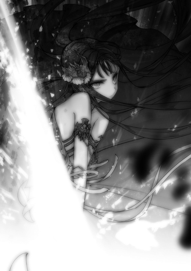伊丽莎白伸出手,她的手中出现红色花瓣与漆黑之暗的漩涡。然后,她从漩涡中猛地抽出一把长剑。
